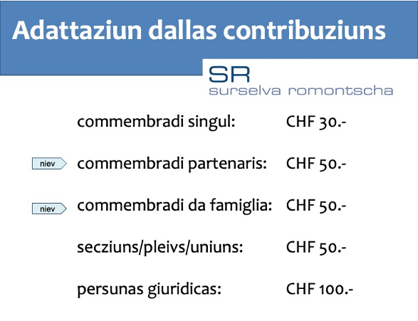 Daventa era ti commember ni commembra dalla Surselva Romontscha! Co? Semplamein seprofitar dallas novas contribuziuns ch’ein vegnidas adattadas a caschun dalla davosa radunonza generala. Commembers ord la medema famiglia pagan ensemen ina contribuziun da CHF 50.-. Quei vala entochen ils affons surpassan la vegliadetgna da 25 onns. Daniev dat ei era ina contribuziun da CHF 50.- per partenaris e partenarias. In commembradi per secziuns, pleivs ni uniuns resta 50 francs. Persunas singulas sustegnan vinavon la SR cun ina contribuziun da 30.- e persunas giuridicas da CHF 100.-.